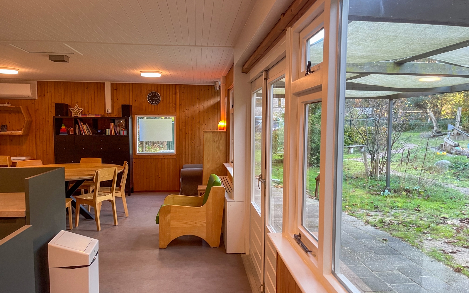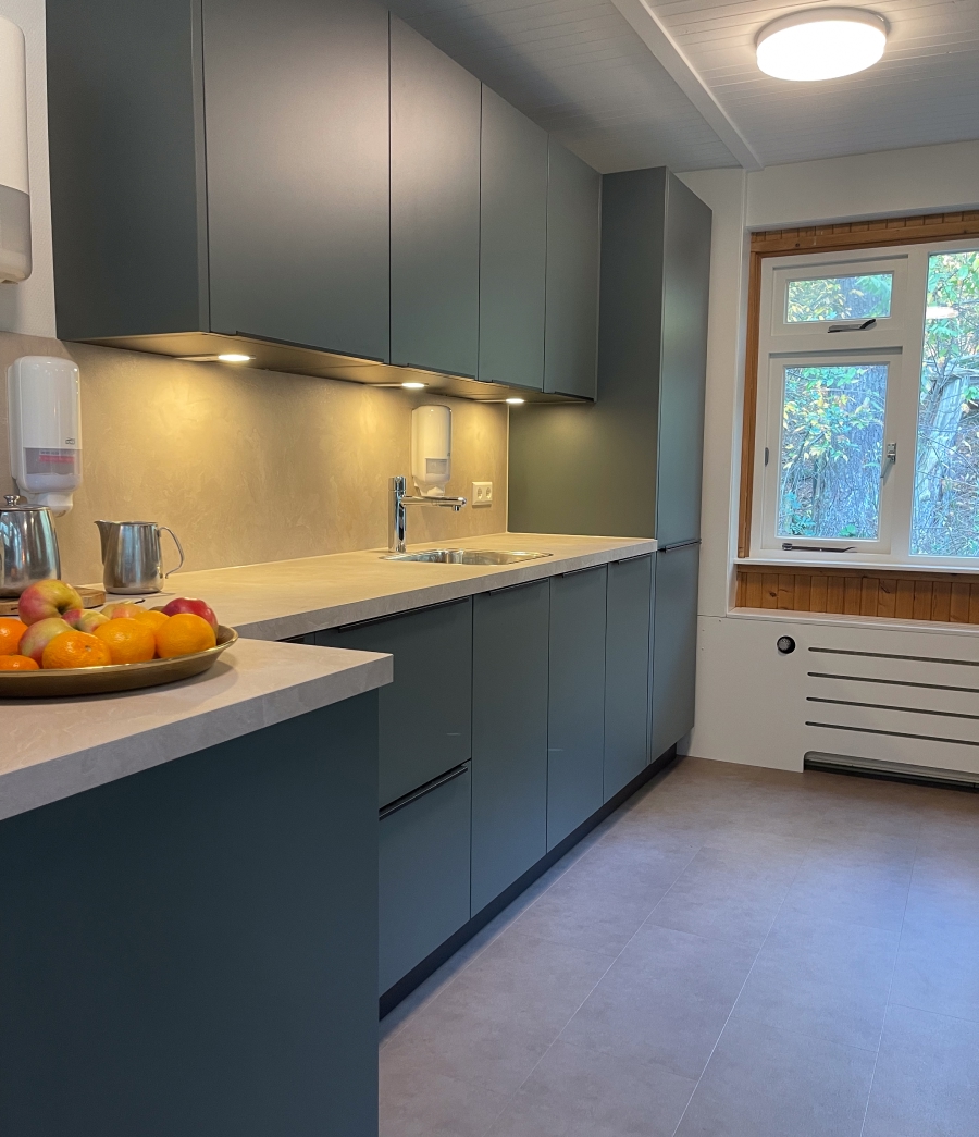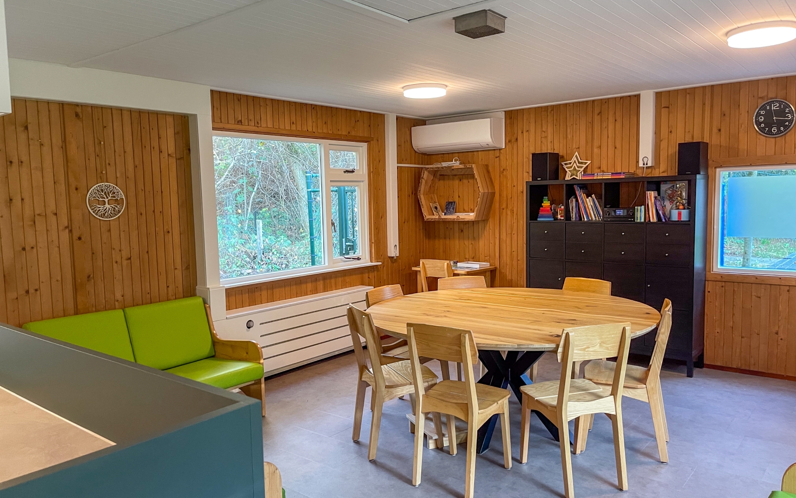 Het hout op de wanden is grotendeels behouden om de warme, huiselijke sfeer te bewaren. De echte blikvanger? Een volledig nieuwe keuken met kookeiland, waar cliënten samen met hun begeleiders van alle gemakken kunnen genieten.